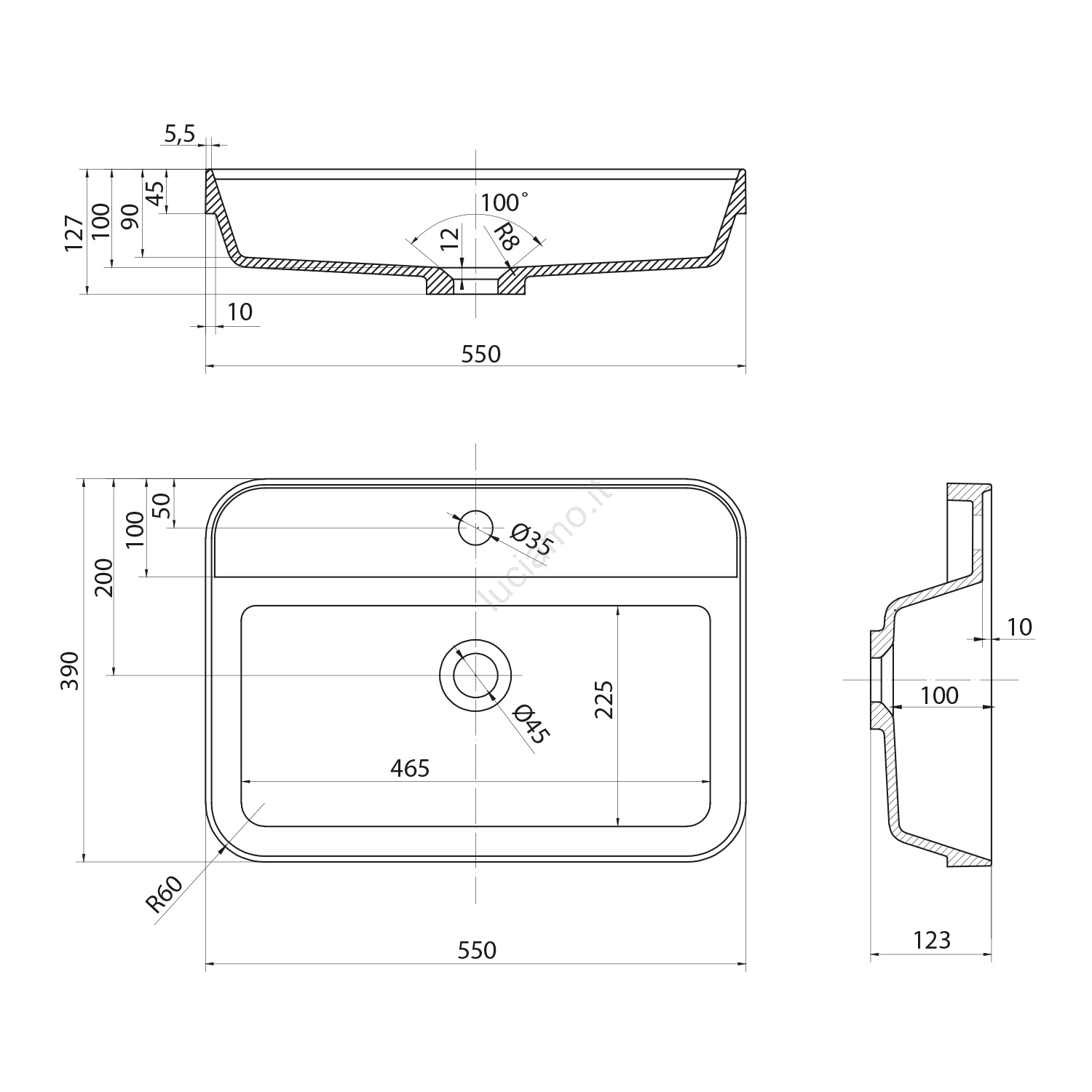 • Ha dimensioni 550x390 mm e un'altezza di 123 mm.