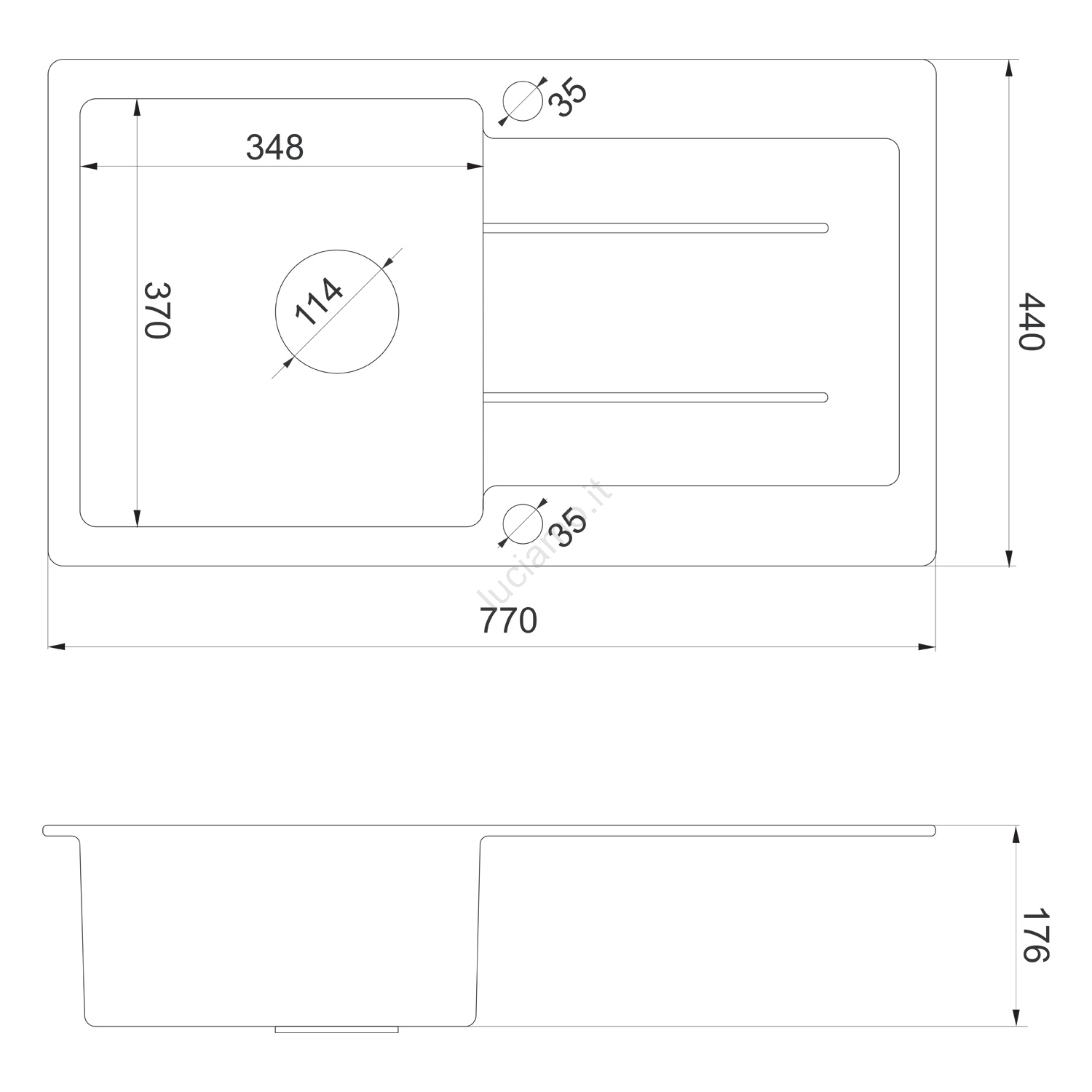 • È progettato per montaggio superiore (top-mount) e include piletta a cestello con sifone.