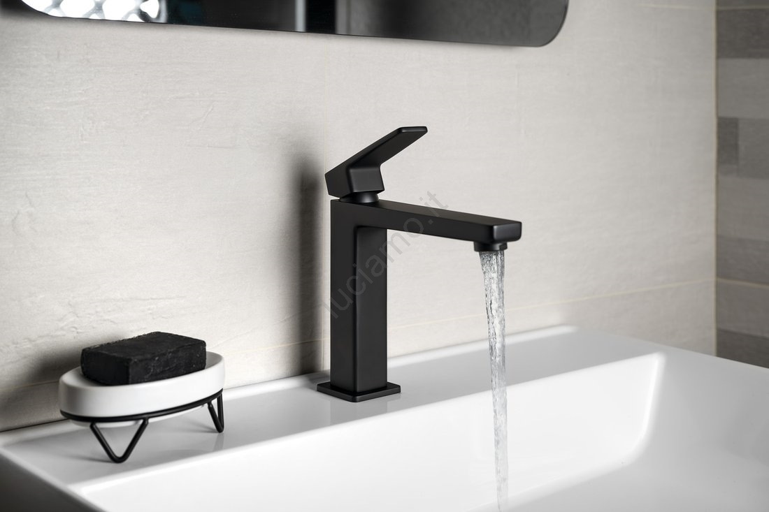• Questo rubinetto per lavabo presenta un design moderno e una finitura nera opaca.