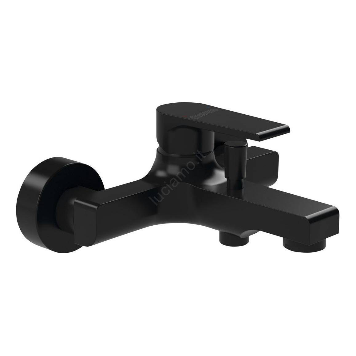 • Questo miscelatore per vasca ha un corpo cilindrico e una bocca squadrata.