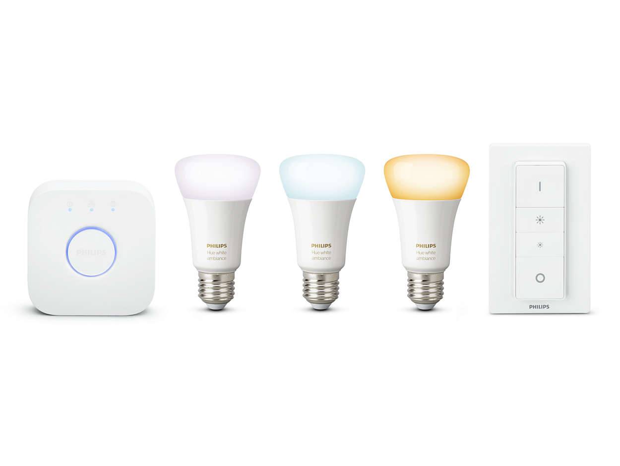 • Il kit include anche un dispositivo di connessione Hue Bridge e un dimmer da parete - ottieni il controllo sull'illuminazione della tua casa.