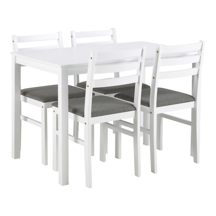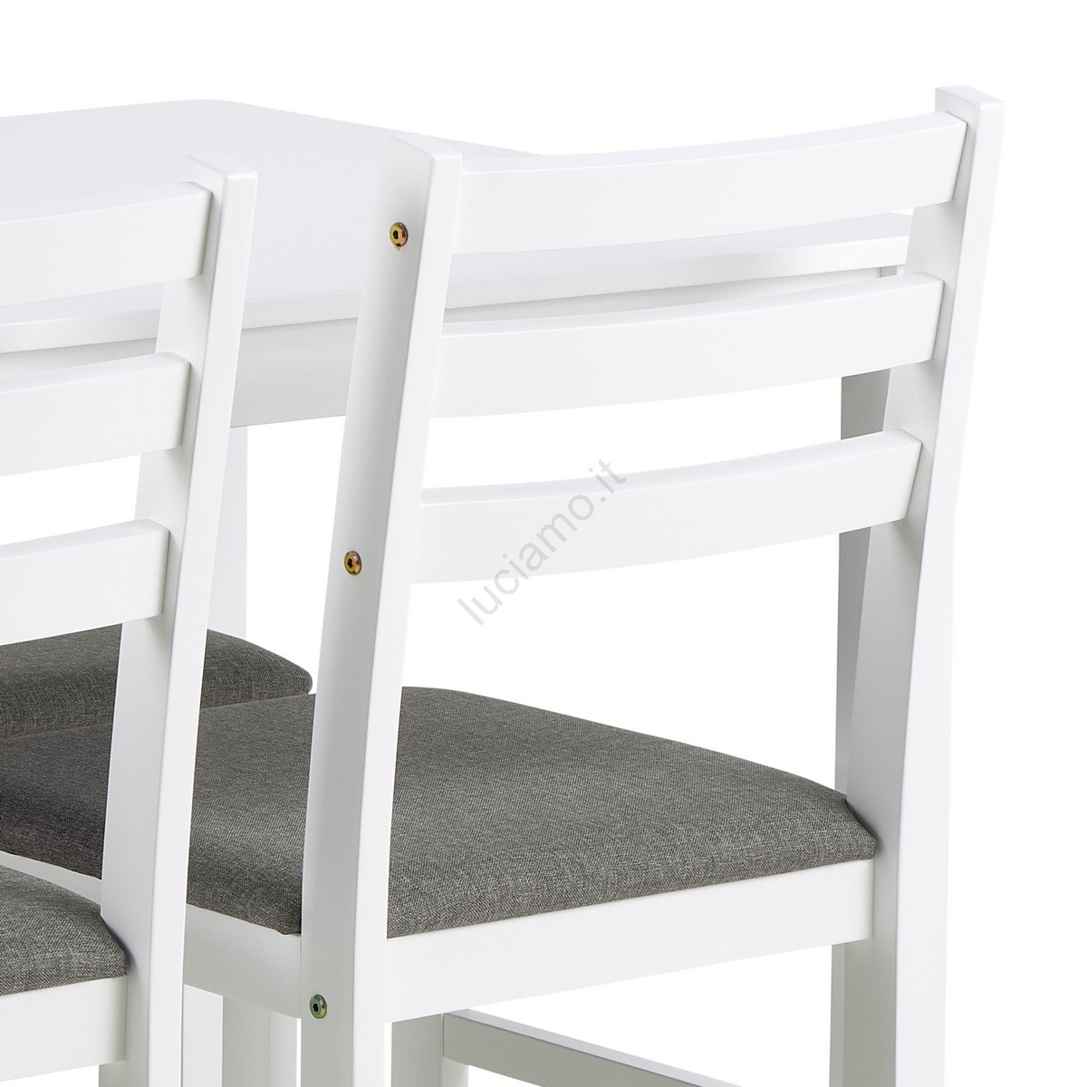 • È composto da un tavolo da pranzo rettangolare e 4 sedie abbinate con sedili imbottiti in grigio chiaro, il tutto realizzato in legno massiccio con finitura bianca.