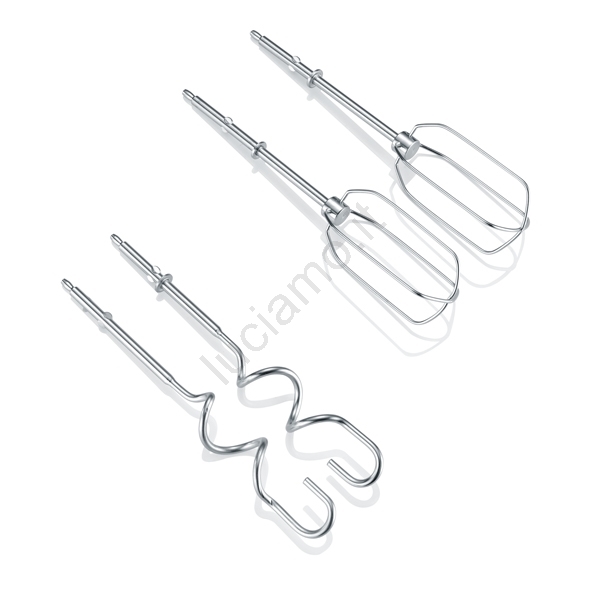 • La confezione include 2 fruste in acciaio inox e 2 ganci impastatori in acciaio inox.