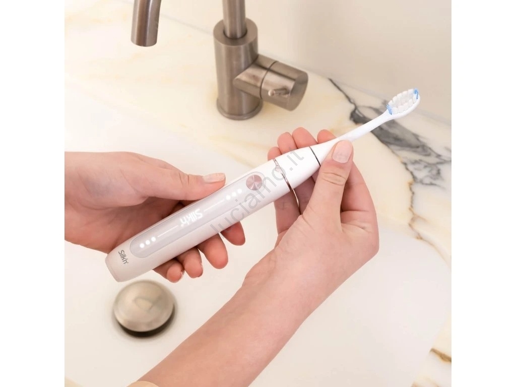 • Silk'n SonicYou è uno spazzolino elettrico sonico ad alte prestazioni che, grazie a vibrazioni ad alta frequenza, rimuove efficacemente la placca e le impurità, anche nelle zone difficili da raggiungere e negli spazi interdentali più profondi.