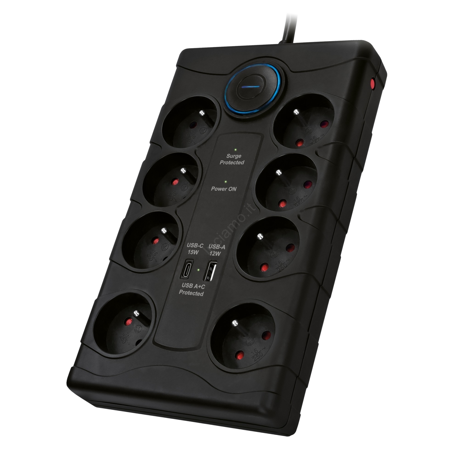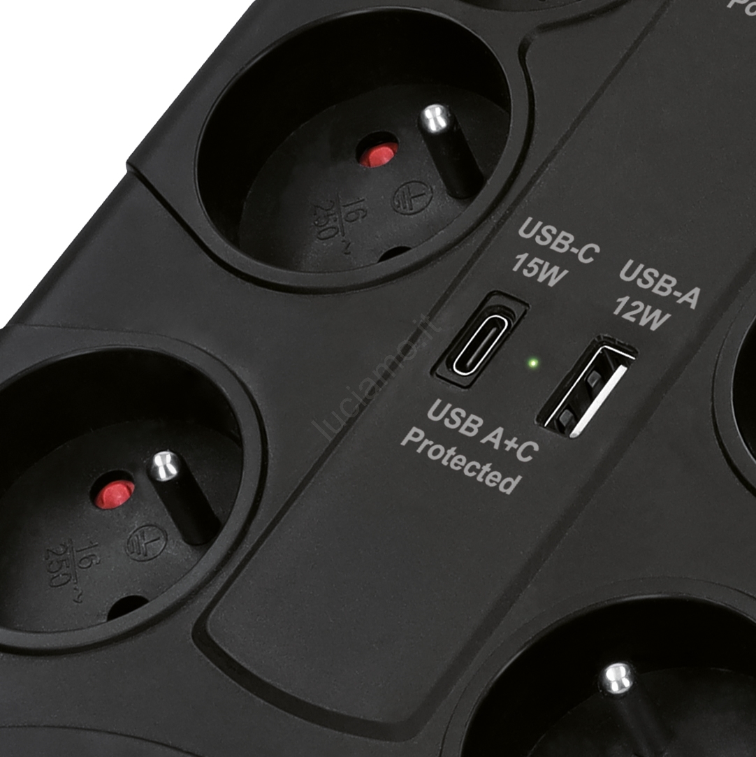 • Indicazione LED: protezione da sovratensioni attiva, prese 230V protette, porte USB A + C protette.