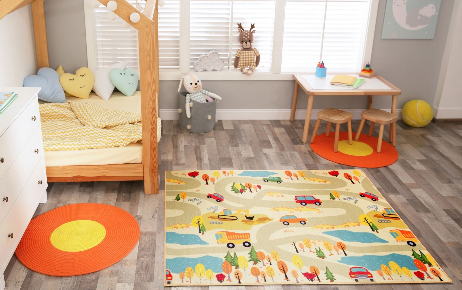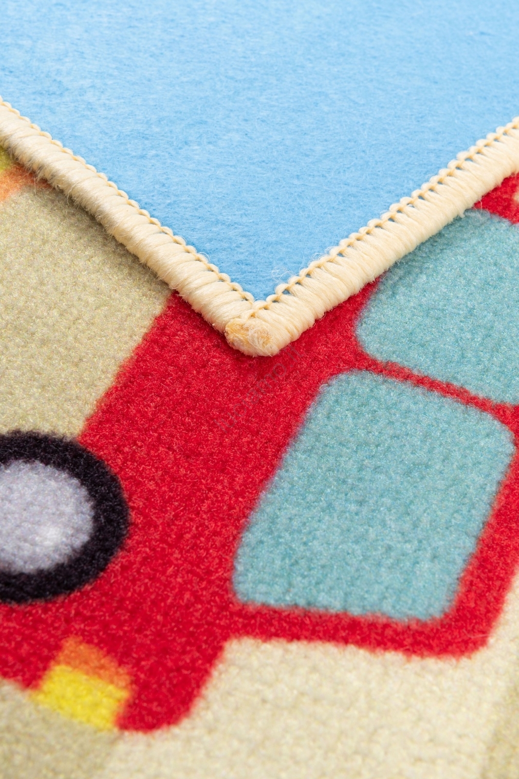 • Tappeto colorato per bambini con motivo urbano.