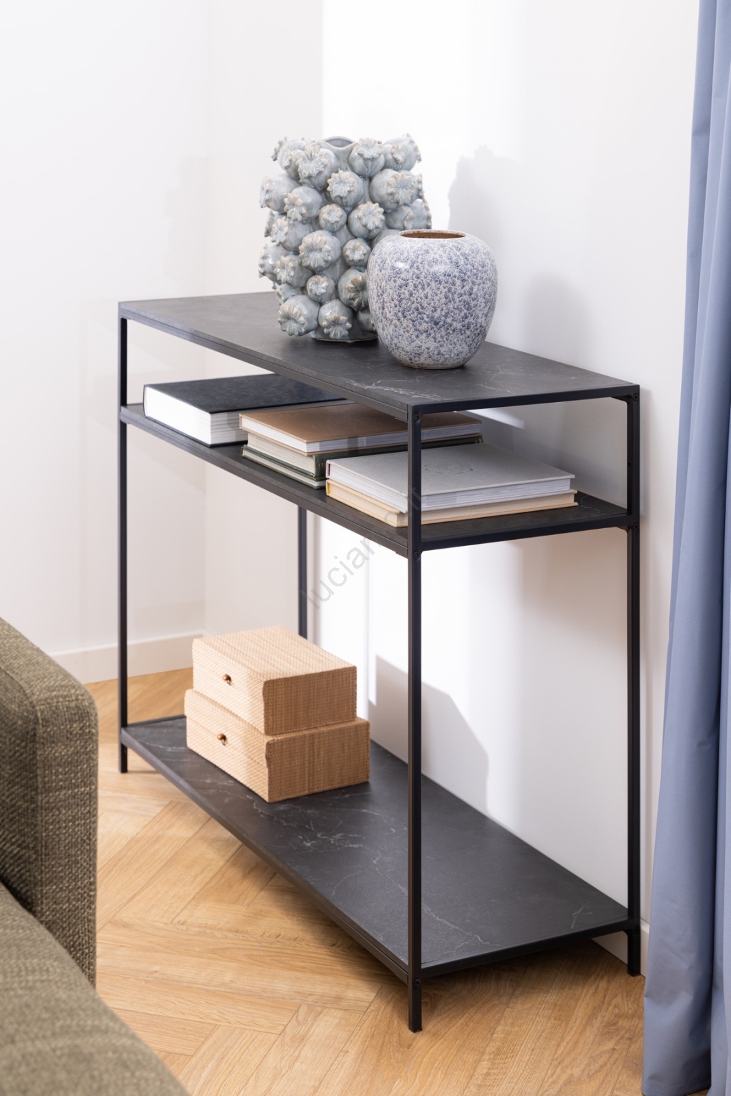 • Grazie alle linee pulite, all'aspetto marmoreo e alla vernice nera a polvere, il tavolo console si adatta all'ingresso, al soggiorno o addirittura a una cabina armadio.
