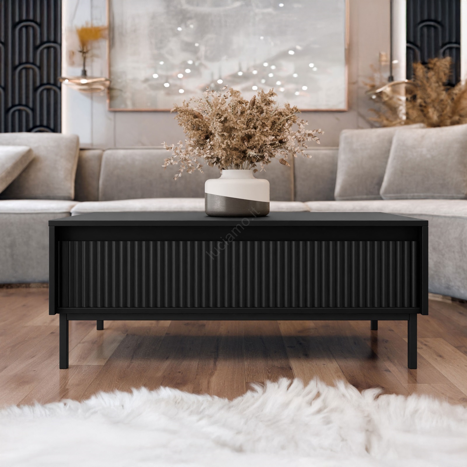 • Il tavolino è completato da una solida struttura metallica con piedini in nero a contrasto.