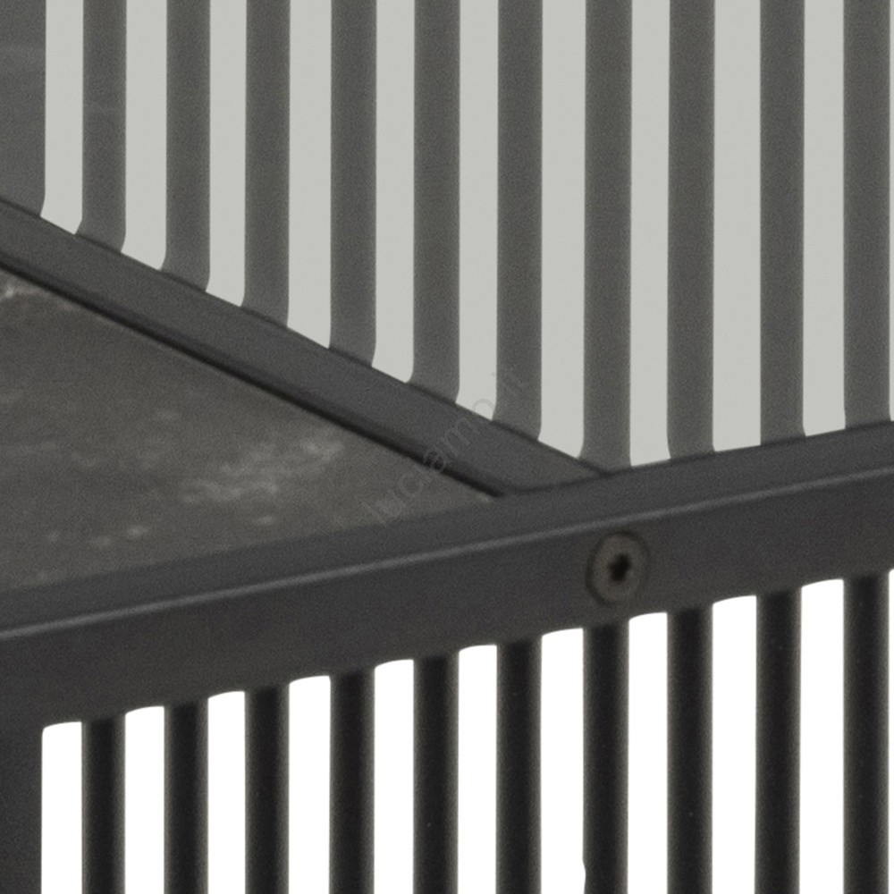 • Piano superiore in melaminico Izmir nero opaco a grana grossa e vetro temperato fumé, base in acciaio verniciato a polvere nero opaco a grana grossa con vano aperto.