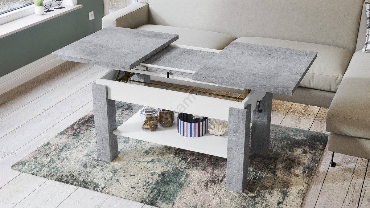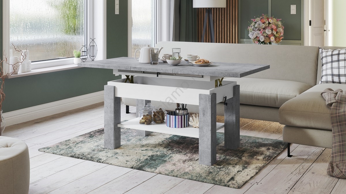 Tavolo allungabile da salotto/pranzo con ripiano ADONIS grigio cemento/bianco