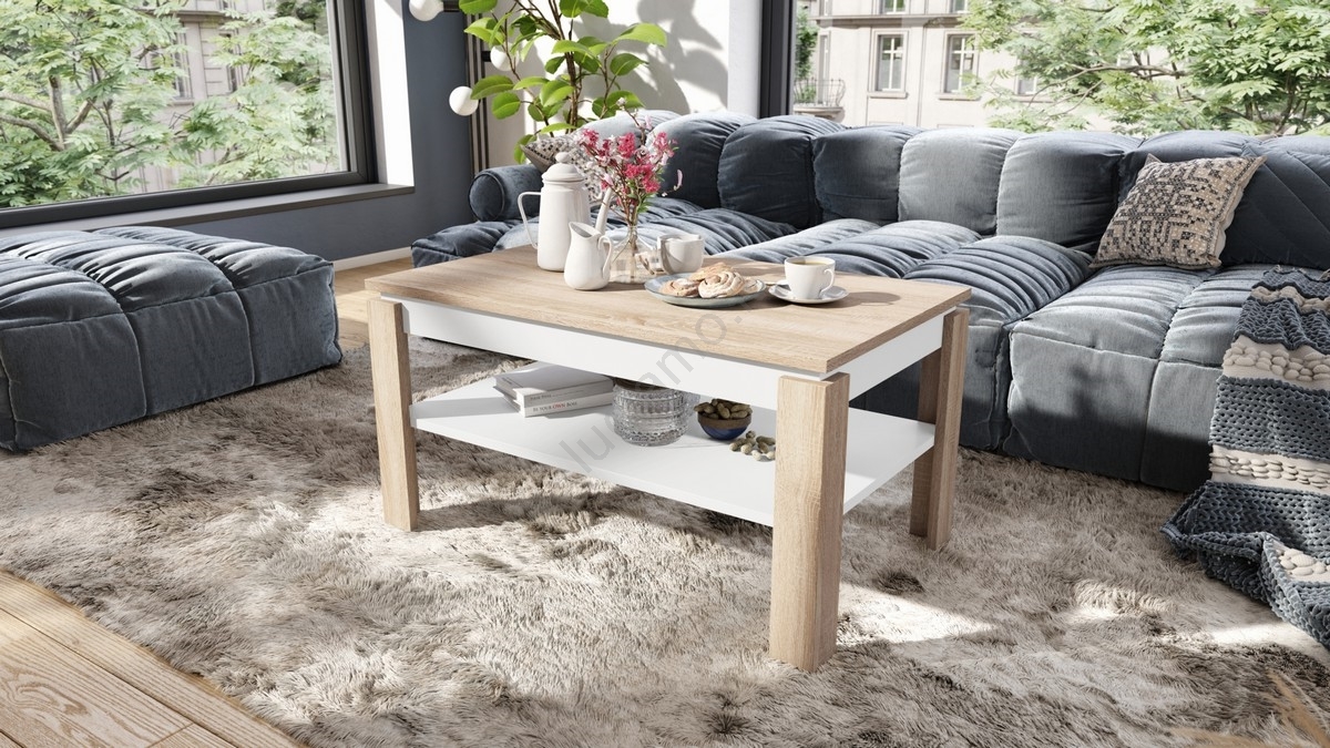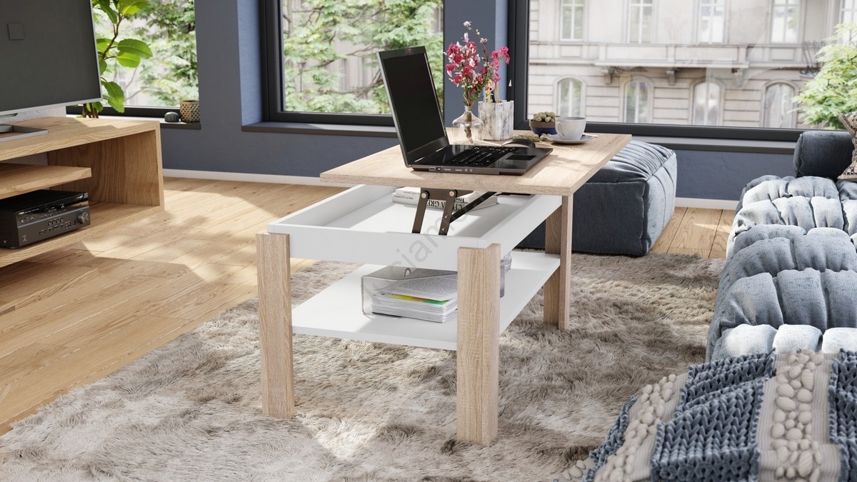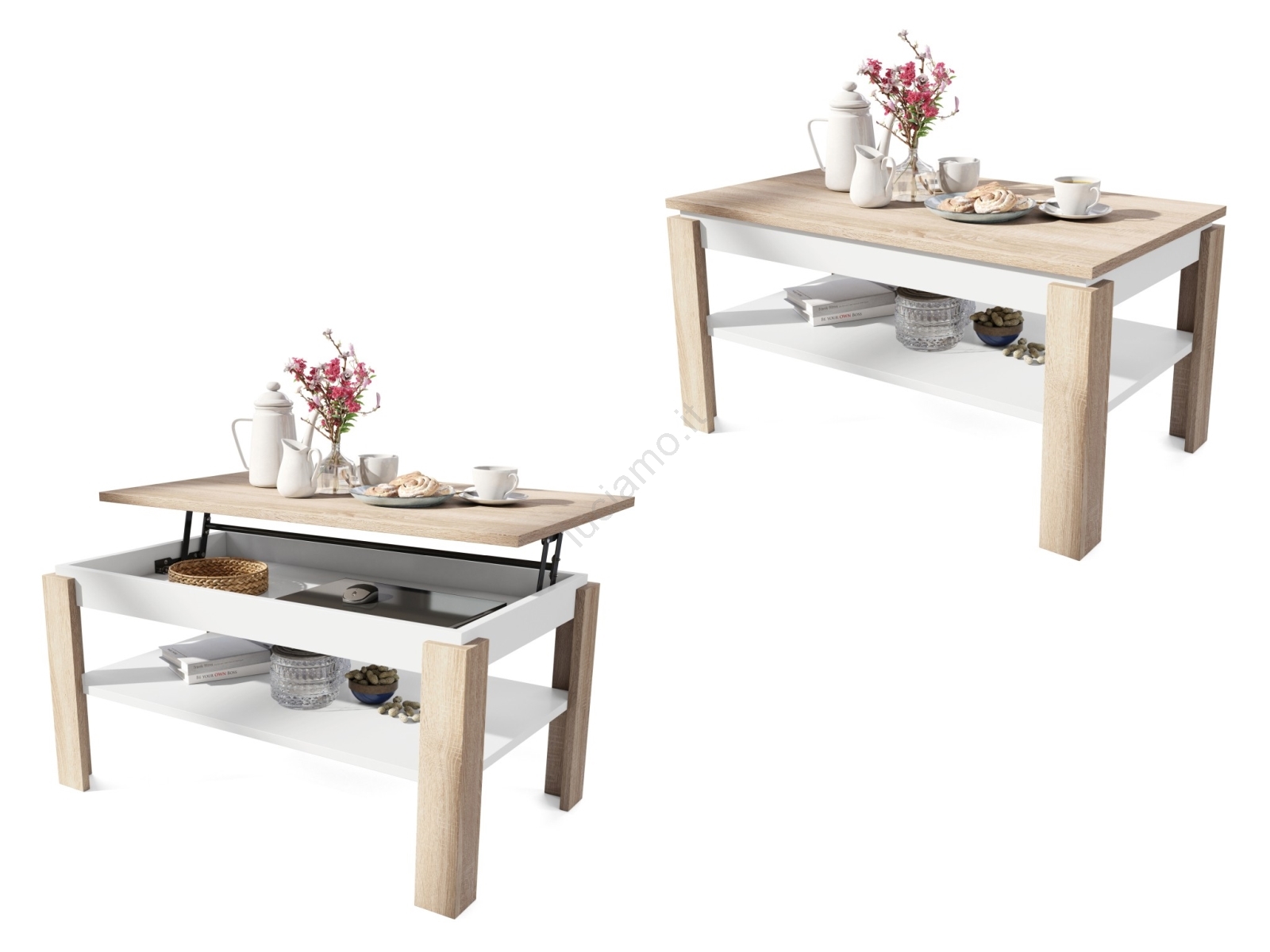 Tavolino da salotto allungabile con piano sollevabile e ripiano ADEN rovere Sonoma/bianco
