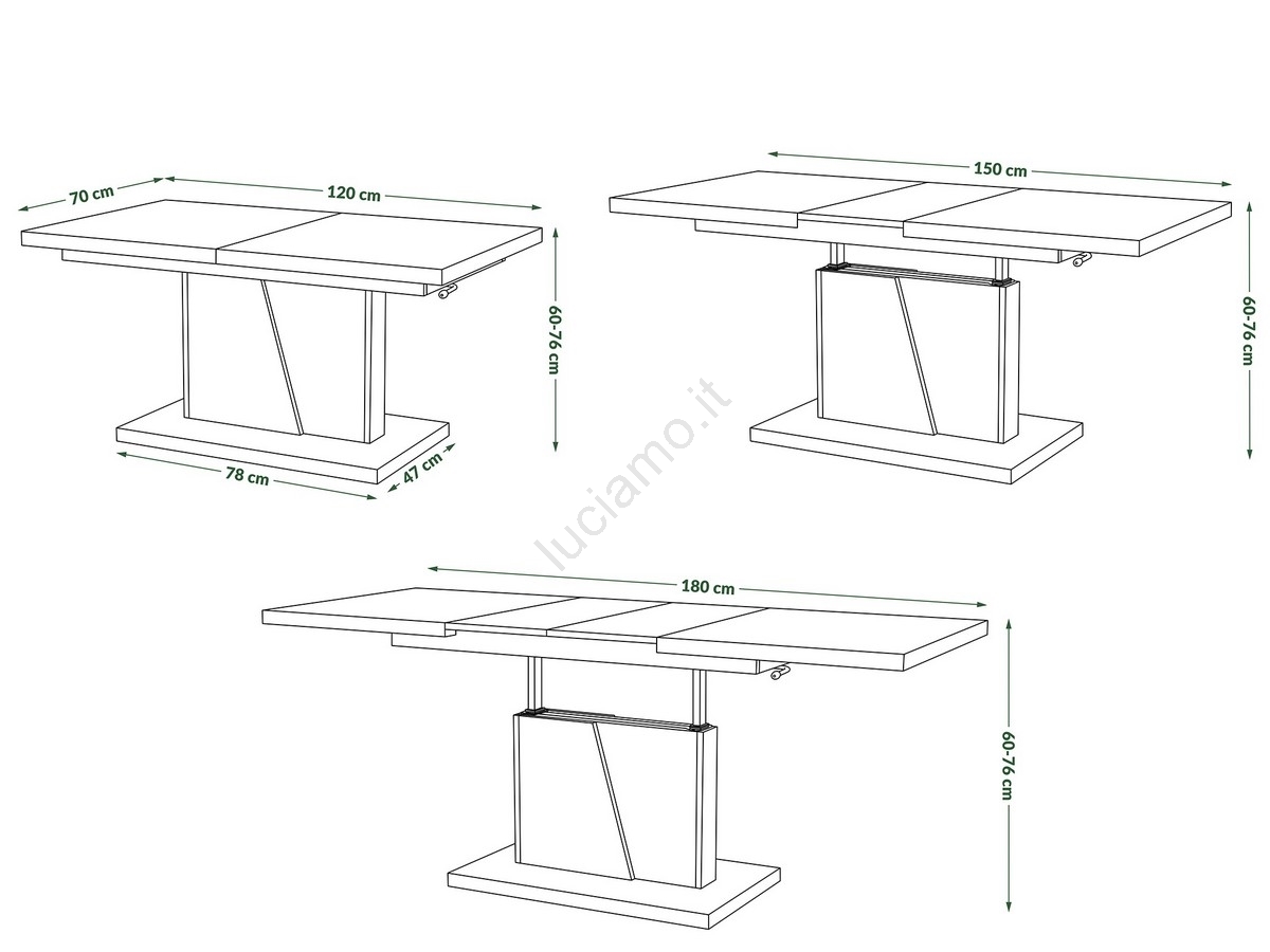 • Grazie a due inserti da 30cm il piano del tavolo può essere allungato a 150 o 180 cm.