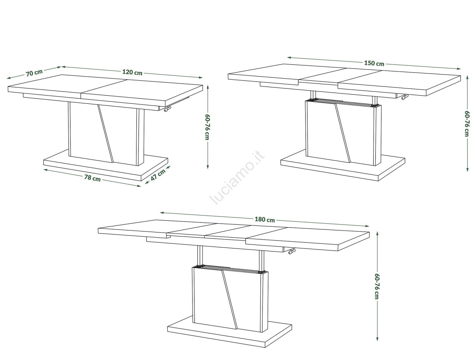 • Il piano può essere sollevato fino a un'altezza di 76 cm.