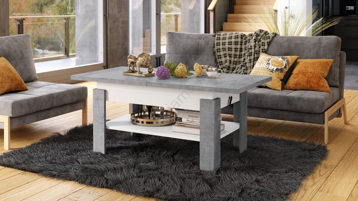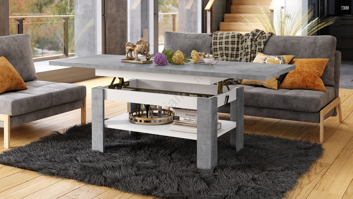 • Tavolino da salotto allungabile con piano sollevabile ROY 130/170x65 cm grigio cemento/bianco