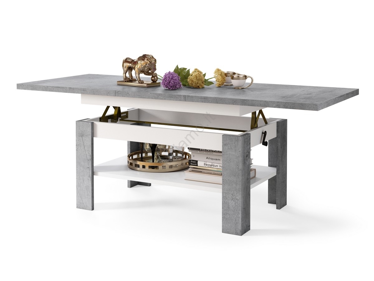 Tavolino da salotto allungabile con piano sollevabile ROY 130/170x65 cm grigio cemento/bianco