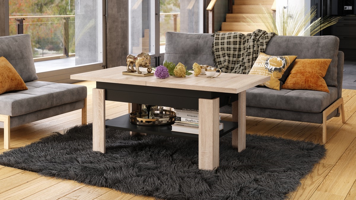Tavolo trasformabile salotto/pranzo con piano sollevabile ROY rovere sonoma/nero