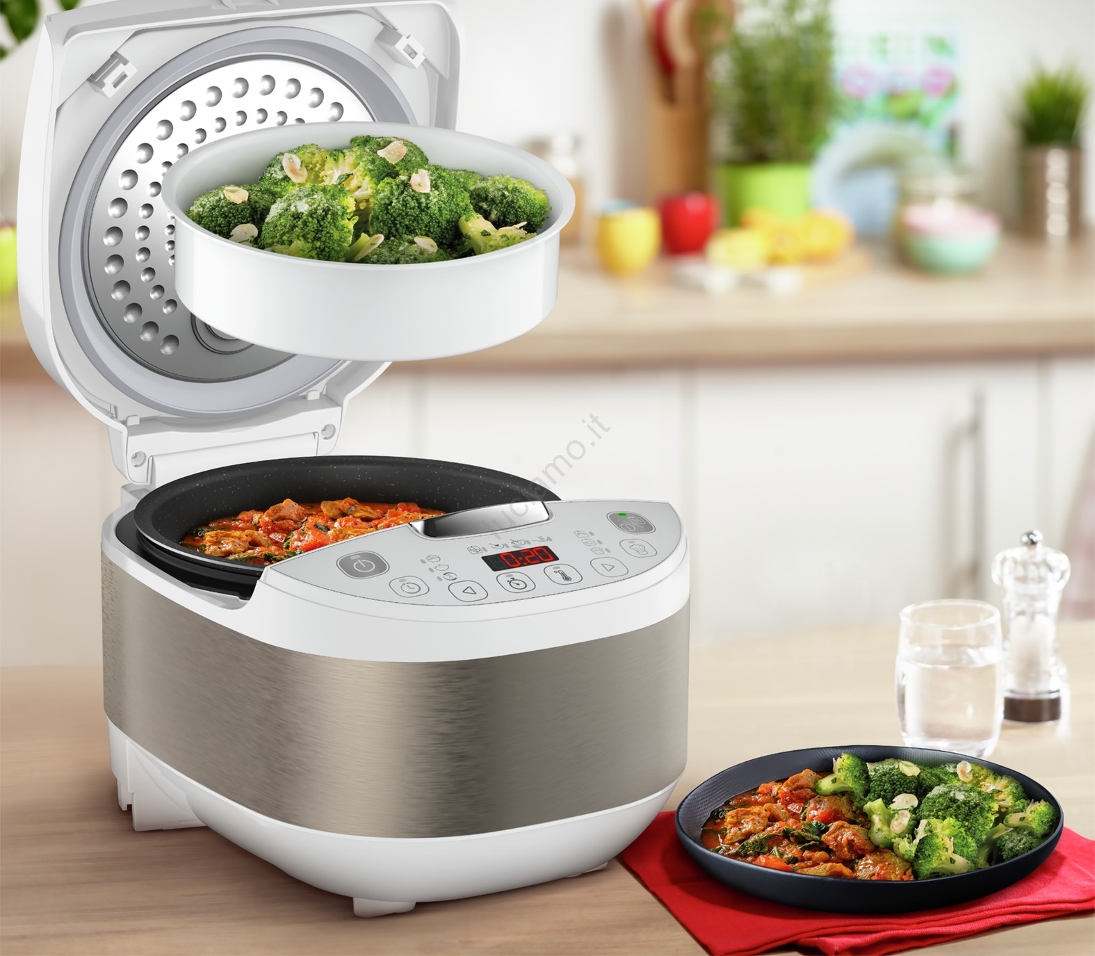 • Nella confezione è incluso un ricco corredo di accessori: cestello per la cottura a vapore, cucchiaio, mestolo e misurino.