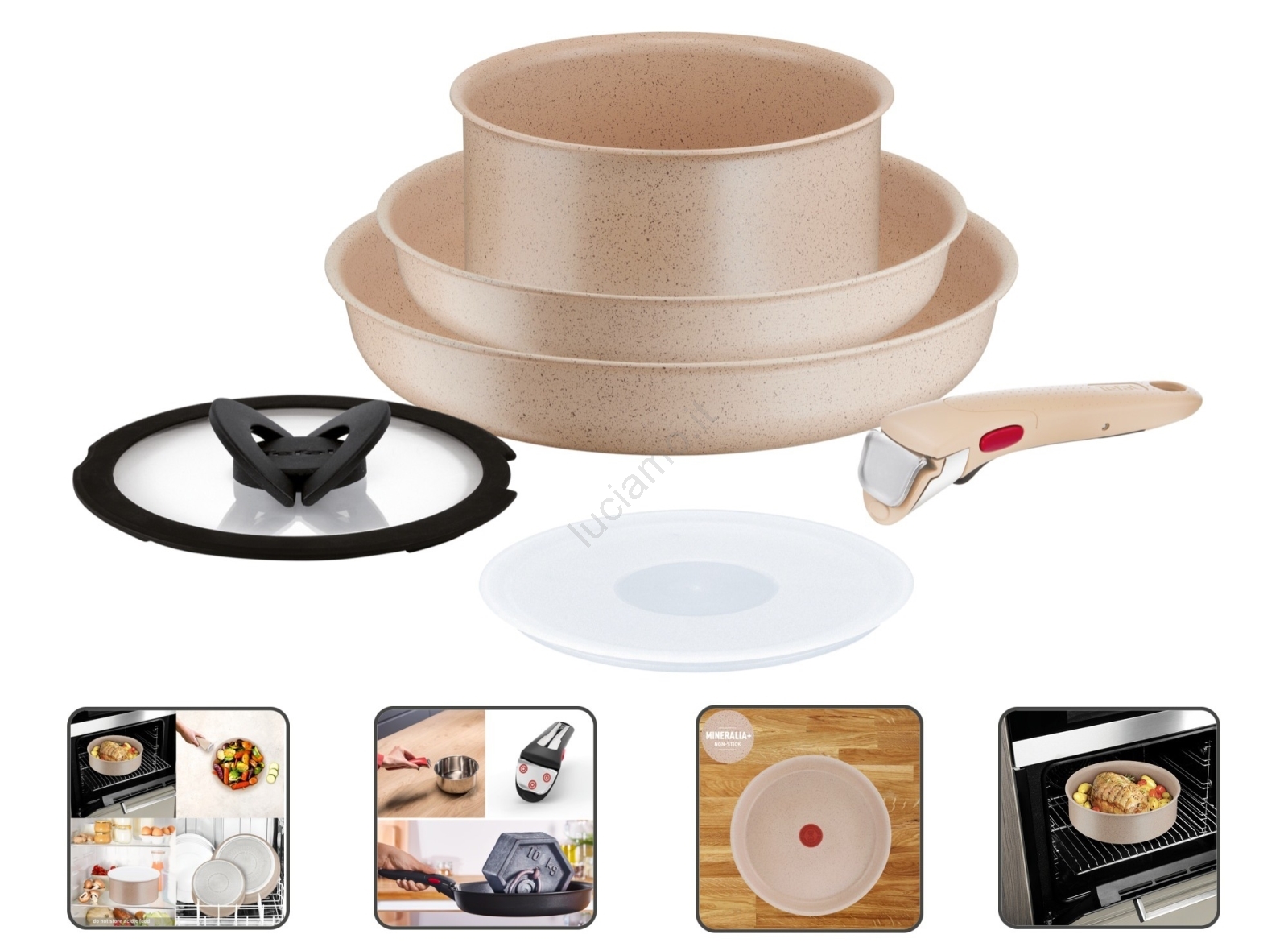 • Grazie al manico removibile e al design impilabile è possibile risparmiare fino al 50% di spazio negli armadietti della cucina.