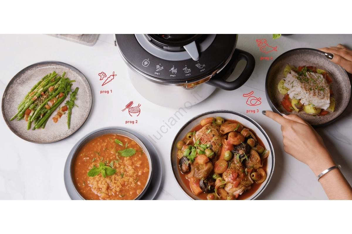 • La pentola offre 4 programmi preimpostati (verdura, cereali/legumi, carne, pesce), che facilitano la preparazione di differenti tipologie di alimenti.
