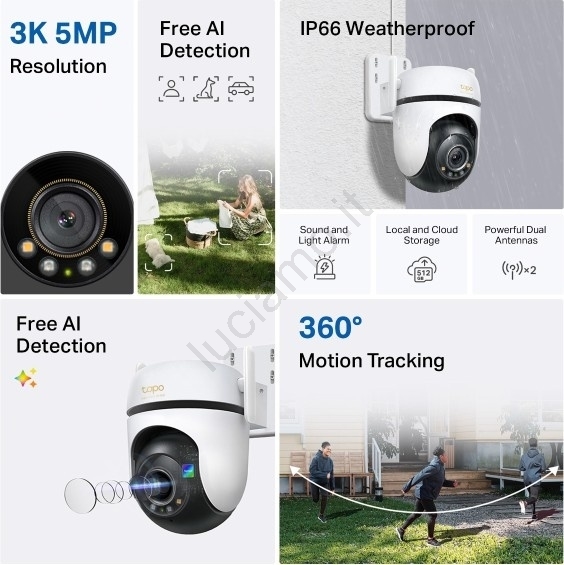 • La telecamera è progettata come videocamera di sicurezza Wi-Fi per esterni con testa orientabile, per un'ampia copertura dell'area e con rilevamento intelligente del movimento di persone, animali e veicoli.