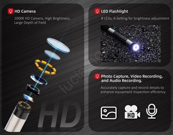 • Adatto per il controllo di motori, tubazioni, condotti, cavità edilizie, scarichi e altri spazi stretti e curvi.