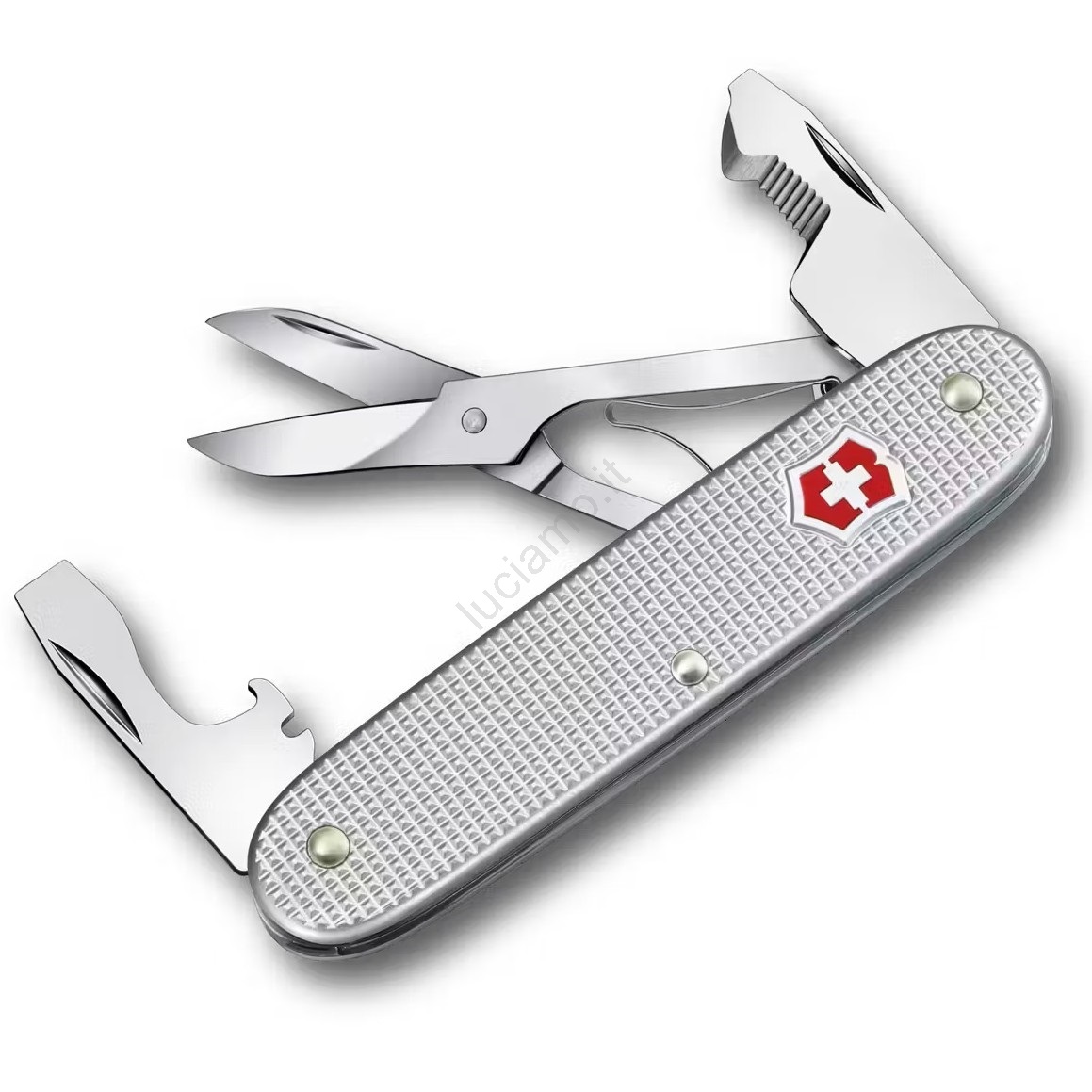 • Ha 6 funzioni versatili: forbicine, taglierina per scatole (box-opener), apribottiglie, cacciavite a lama piatta da 7 mm e 3 mm, pinza spelafili.