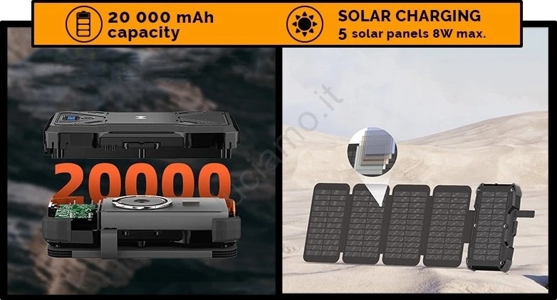 • Powerbank da 10000 mAh con ricarica solare e wireless e torcia LED integrata.