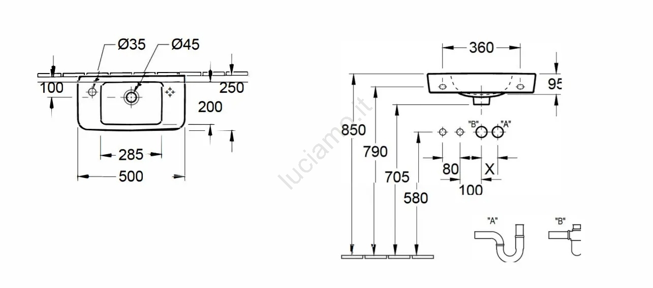• Il miscelatore per lavabo e la piletta non sono inclusi nella confezione.