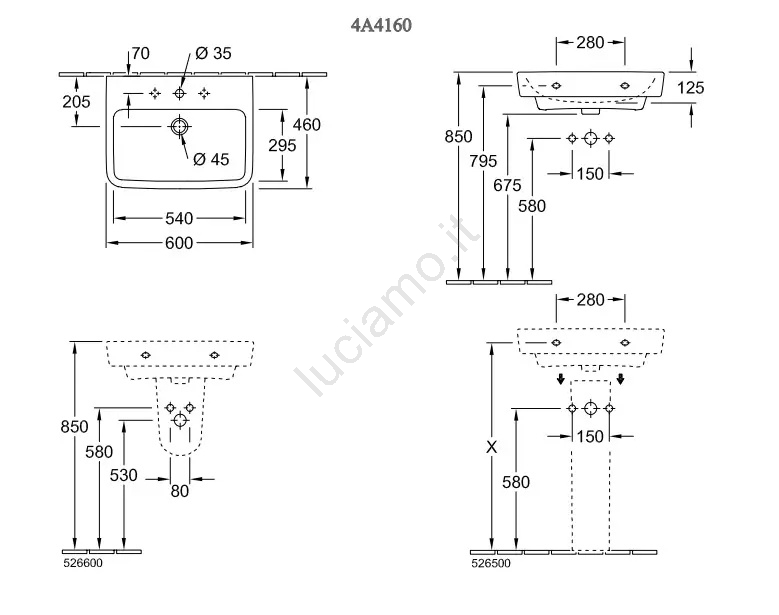 Villeroy & Boch 4A416001 - Lavabo sospeso O.NOVO 60x46 cm, ceramica/bianco