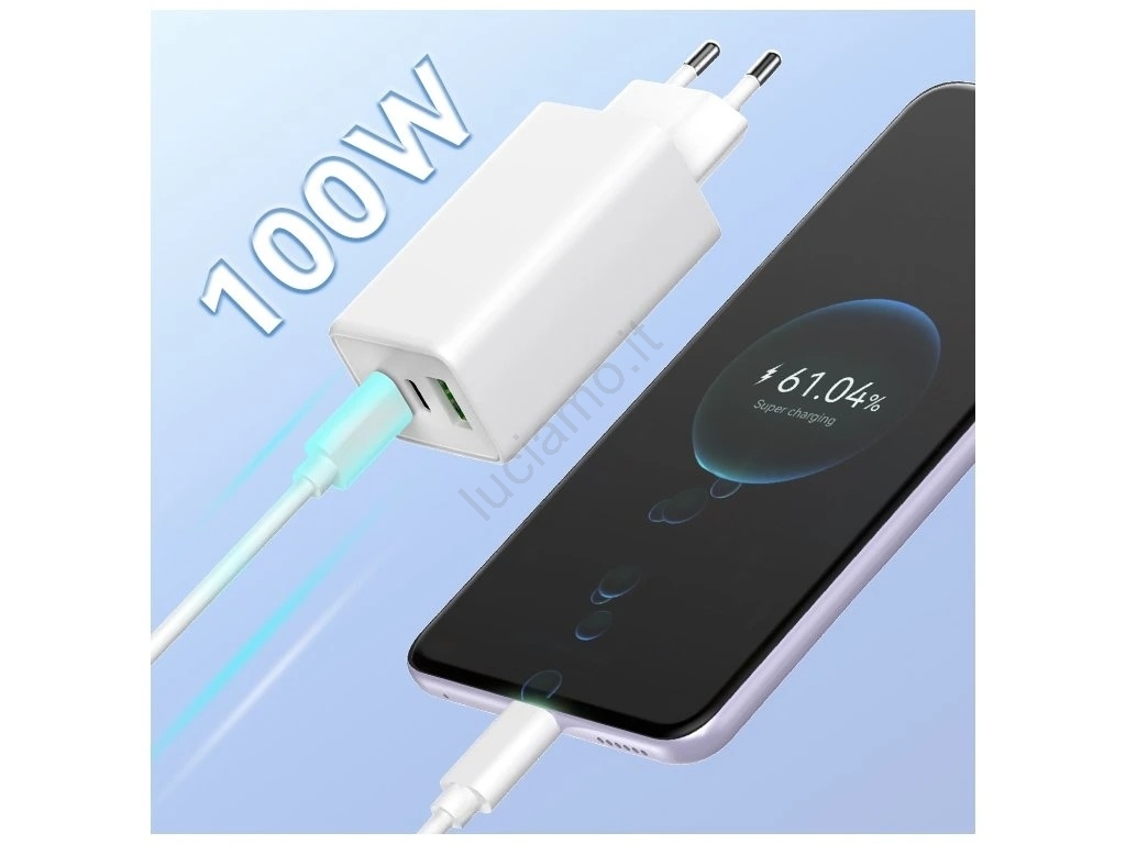 • Il caricabatterie da rete GaN 100 W è compatto, estremamente potente e resistente al surriscaldamento, ideale per la ricarica rapida dei dispositivi moderni.