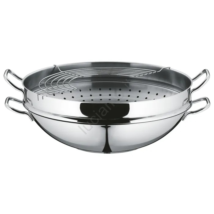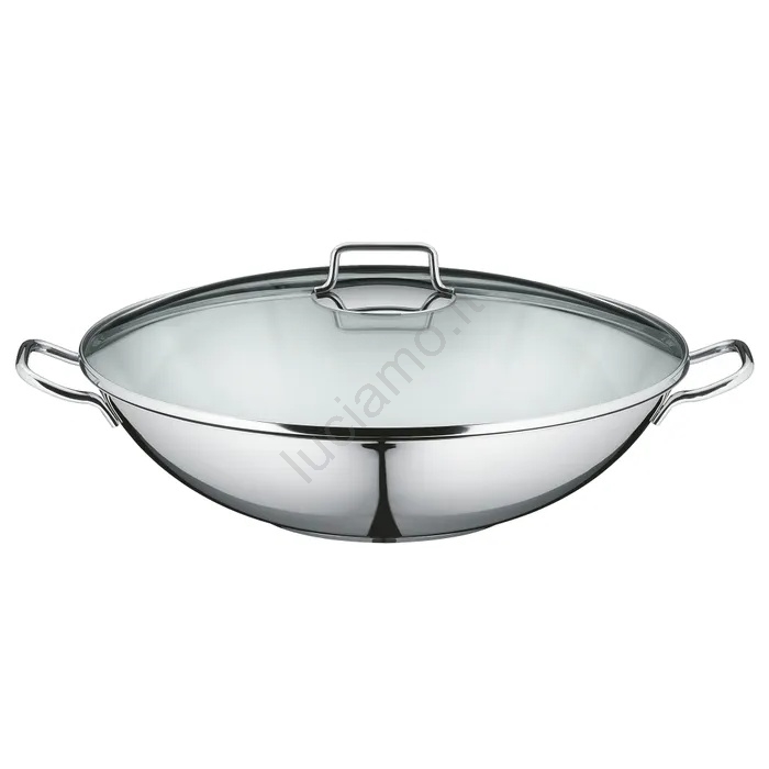 • Set completo in 4 pezzi: la confezione include una padella wok di diametro 36 cm, un coperchio in vetro, un inserto forato per la cottura a vapore e una griglia di appoggio in acciaio inox per mantenere la temperatura dei cibi.